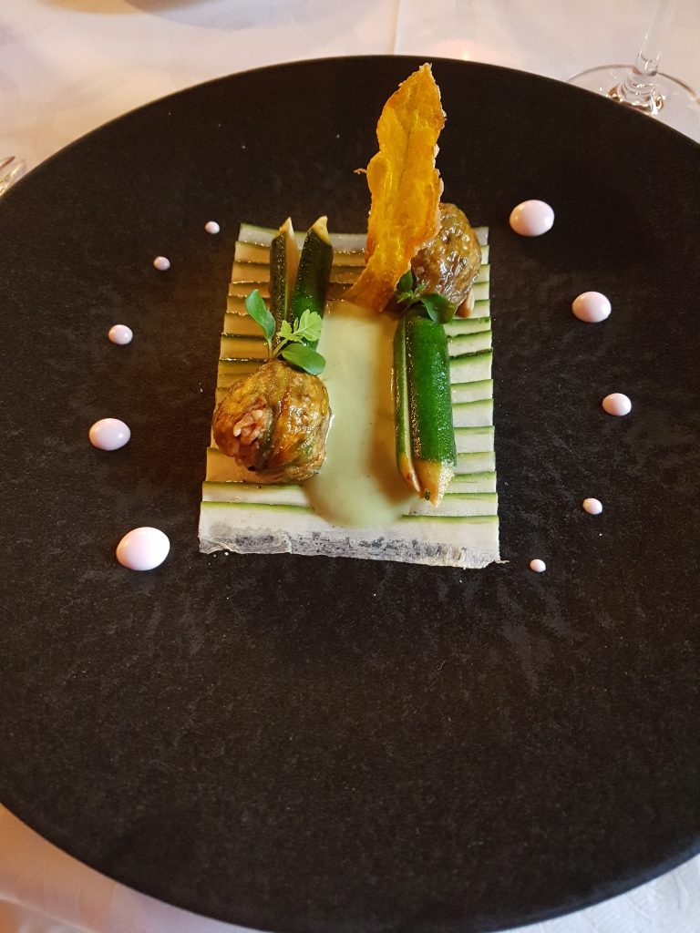 Starter at Chateau de la Treyne – Courgette flowers stuffed with crab